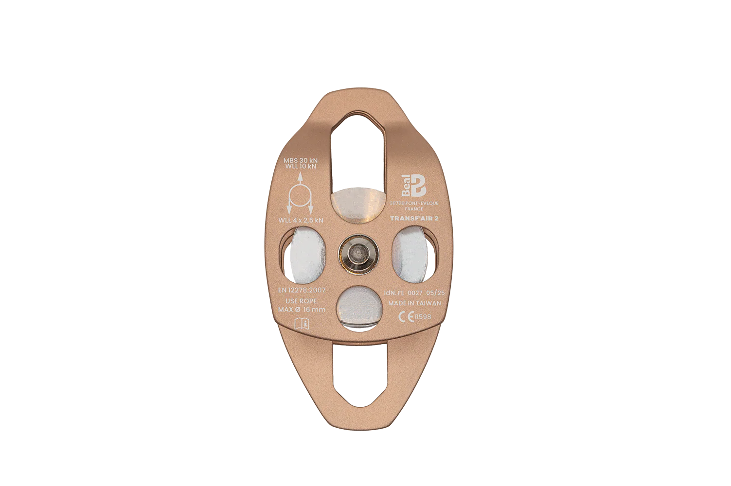 La polea doble TRANSF’AIR 2 está diseñada para el izamiento de cargas. De una sola polea con brida móvil, se adapta perfectamente a cables de gran diámetro, ya que la movilidad de las bridas facilita el posicionamiento de la polea en cualquier punto del cable.